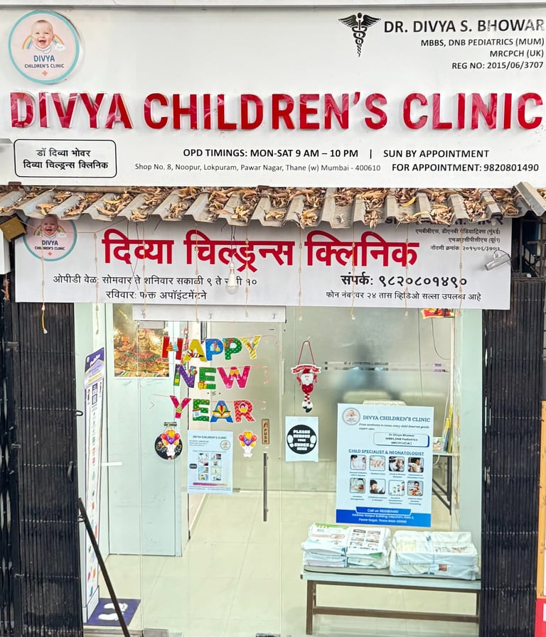 Divya Children's Clinic, Shop No 8, Noopur building, Lokpuram Gate 3, Pawar nagar, Opposite Hiranandani Meadows, Thane West-400610.